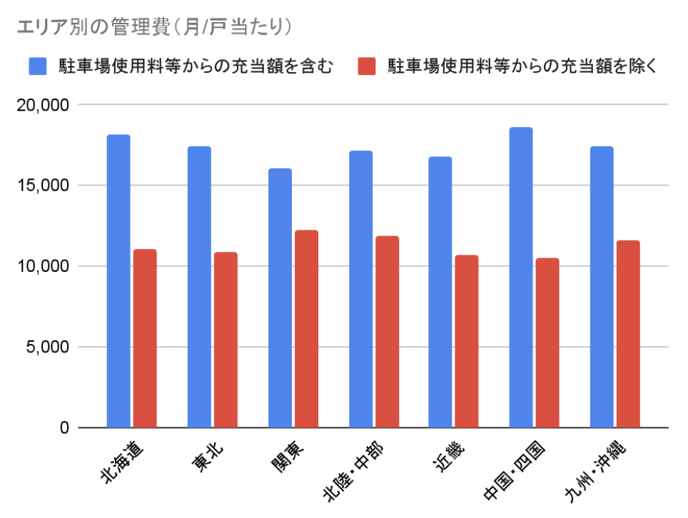 エリア別にみると、「関東」「北陸・中部」「九州・沖縄」が管理費(駐車場使用料等からの充当額を除く)の平均額が高い傾向があります。