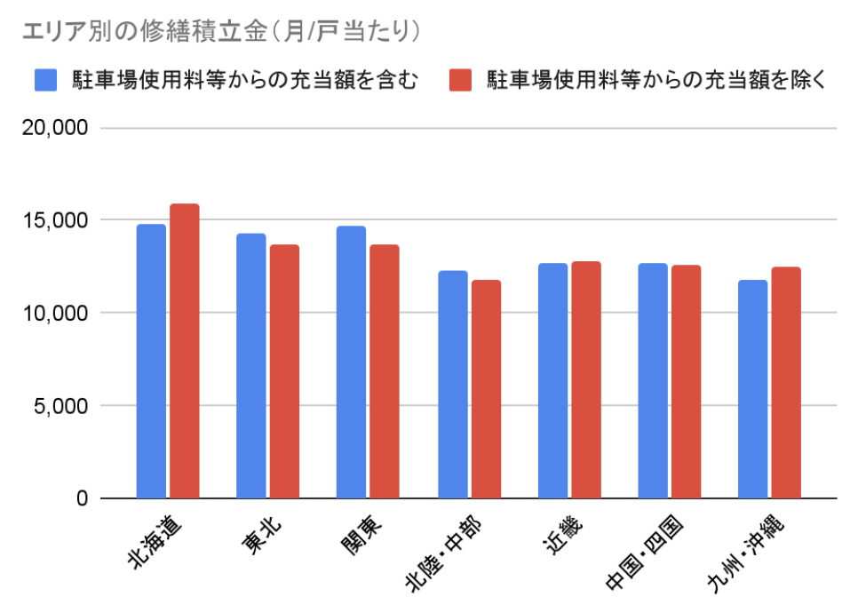 修繕積立金は、「北海道」「東北」「関東」がほかと比べて高い傾向です。