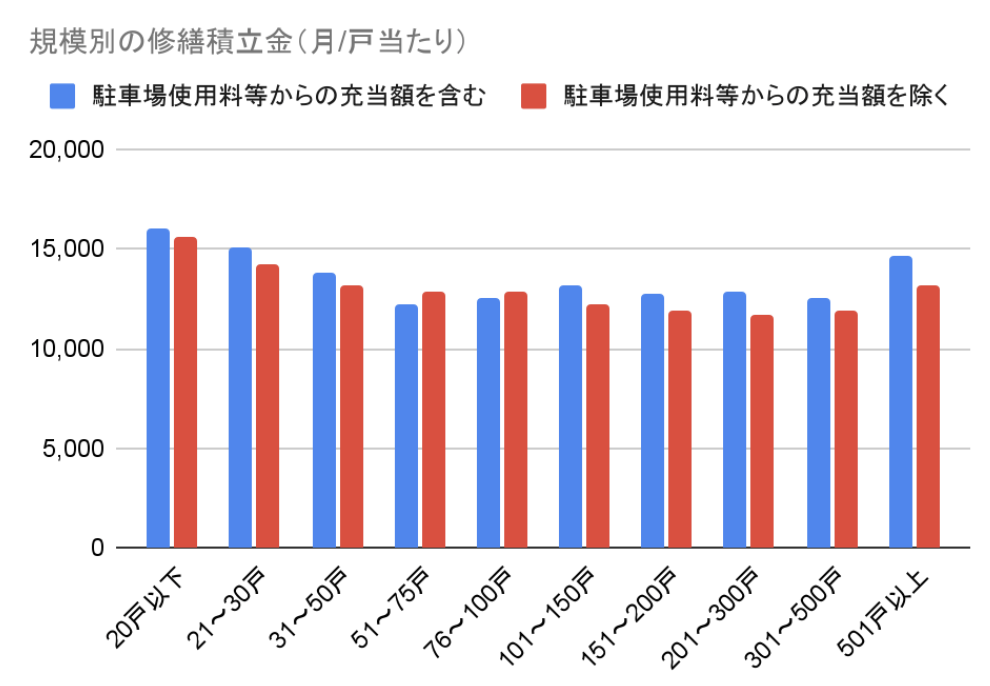 上記のグラフはマンション規模別の管理費と修繕積立金の平均額です。
