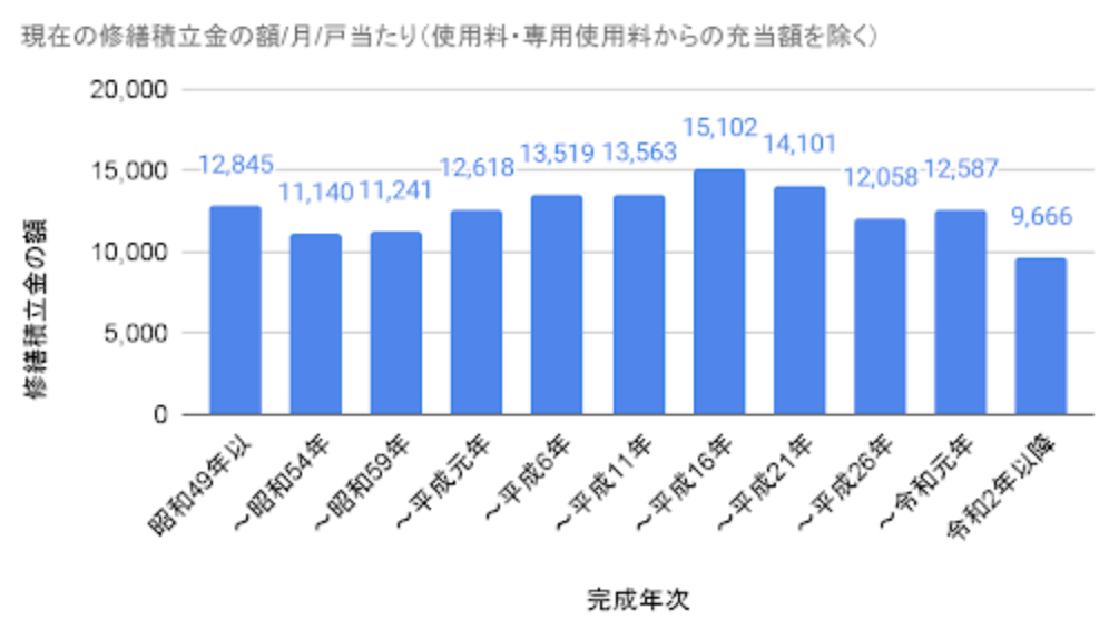 一部例外はありますが、平成12年からは完成年次が新しいほど、修繕積立金は低額です。これは「新しいマンションほど値上げが進んでいない」と読み取れ、築年数が経過するにつれて値上げされる可能性が高いと考えられます。