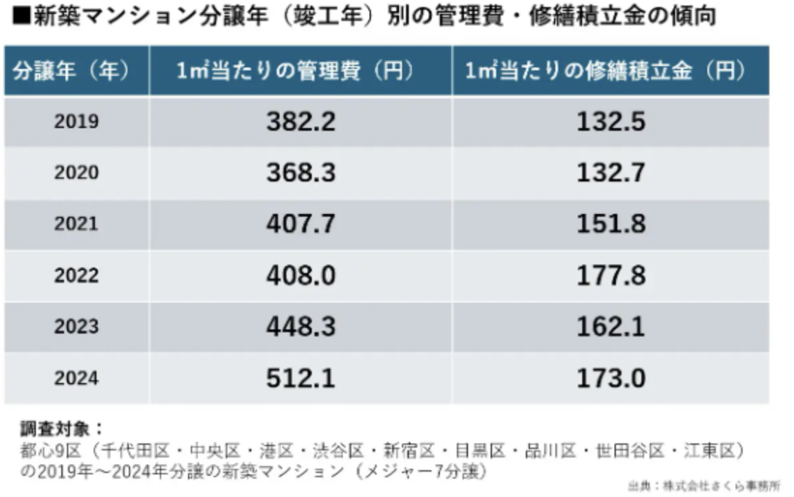 さくら事務所が都心9区の2019年~2024年に竣工された新築分譲マンションの管理費・修繕積立金を集計した結果、1㎡当たりの単価はどちらも増額傾向にありました。